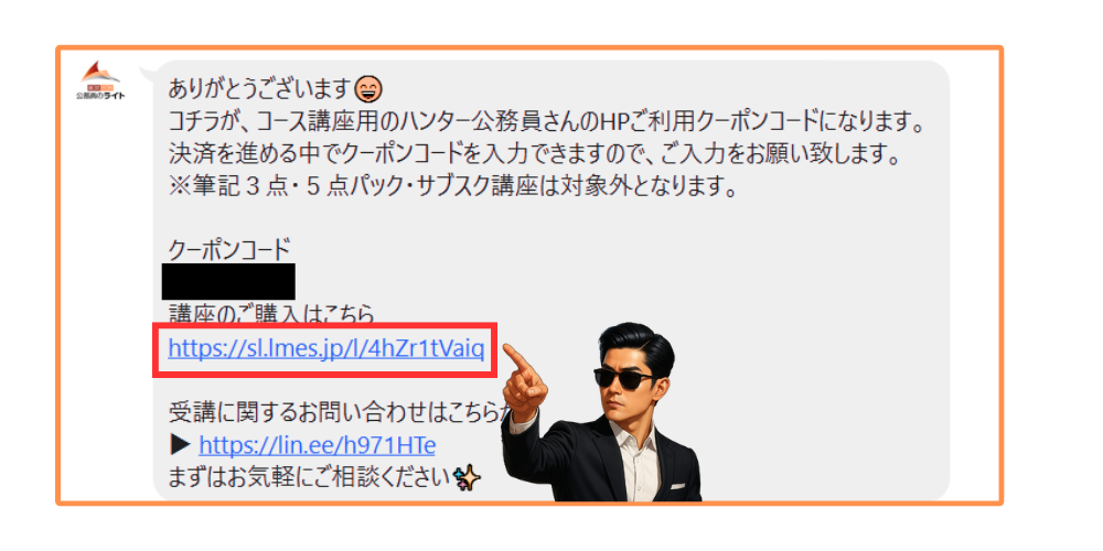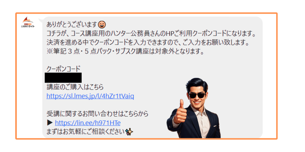 LINEをスクロールすると、「割引クーポンを発行する講座をお選び下さい」というメッセージがあります