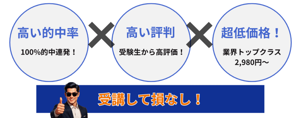 出題範囲が曖昧でわからない科目だからこそ、プロに頻出テーマを絞ってもらうことで一気に差がつきます